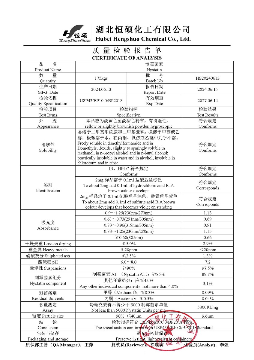 英文别名: Nystatinum;nystatin suspension cell culture tested; Nystatin, Streptomyces noursei, Sterile, TC Grade; Nystatin